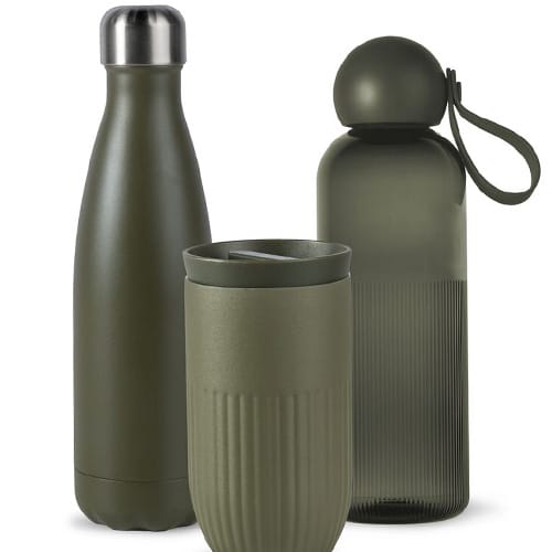 En funktionell, hållbar och uppskattad gåva. Muggen och stålflaskan är diskmaskinsäker, vattenflaskan och kräver handdisk.